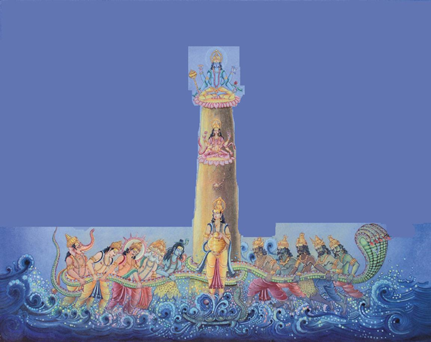 The Devas & Asuras are anthropomorphic representations of the Cosmic benevolent & malevolent Life Energies. The Central Pillar is the Atma, the Divine Centre in man, which is outside Time and which thus stands like a rock, as all the turbulence, the ups & downs of life happen around it. The upper end of the Central Pillar (Atma) merges in Godhead, or Ultimate Reality, Nameless, Formless, Unknowable & Unseen. We may also note that Atma, the bedrock underneath our consciousness is the Primordial Awareness, generally referred to as Chaitanya.